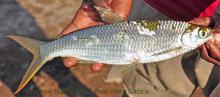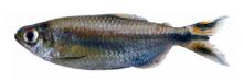 Тело немного вытянутое, сплющенное с боков. Спинной плавник серповидный. У самцов на кончиках спинного, анального и брюшных плавников небольшие белые пятна (у самок отсутствуют). Кроме того, они крупнее и ярче. Окраска: спина серо-голубая, бока голубые. Вдоль тела проходит сиреневая полоса. Сверху ее дублирует желтая полоска. Ниже полосы брюхо голубое с сиреневым отливом. Вырастают до 6 см.