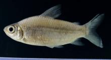 Тело немного удлиненное, сжатое с боков. Рыло вытянутое и немного задранное вверх. В спинном плавнике 11-12 мягких лучей, в анальном 9-10. Самцы мельче самок. Окраска: общий фон серебристо-серый. Грудные, брюшные и анальный плавники оранжевые. Вырастает до 18,9 см SL.