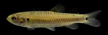 Тело удлиненное с вытянутым рылом и маленьким ртом. Самцы мельче и стройнее самок и ярче окрашены в брачный период. Окраска: бока беловатые с двумя горизонтальными черными полосами. У основания хвостового плавника небольшой красное пятно. Вырастает до 2,8 см SL