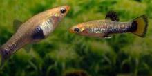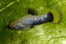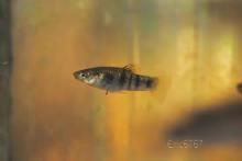 Тело не очень вытянутое в длину и высокое в спине. особенно у крупных самцов (горб). Самки крупнее самцов и скромнее окрашены. Есть экземпляры без полос, однотонного серо-зеленоватого цвета. Самцы голубоватые или сиреневые с тонкими черными вертикальными полосами, которые доходят только до брюха или чуть ниже боковой линии. Хвостовой плавник желтый, а спинной черный. Как и все пецилиевые имеют хорошо развитый гоноподий. Вырастает до 5,5 см (самки).