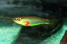 Тело короткое с большой головой. Самцы мельче самок и ярче окрашены. Окраска: общий фон неоново-голубой с красной горизонтальной полосой. Вырастает до 5 см TL