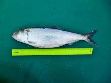 Тело удлиненное, сжатое с боков и крупным ртом. В спинном плавнике 15 лучей, в анальном 18. На нижней челюсти заметный бугорок. Самки крупнее и массивнее самцов. Окраска: спина темно-зеленая, бока темно-серебристые с синевой. На жаберной крышке темное пятно. Вырастает до 50 см SL.