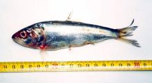 Тело относительно короткое с очень крупной головой. В спинном плавнике 3-4 колючих луча и 12-14 мягких, в анальном 3-4 колючих и 16-21 мягких. Самцы мельче и стройнее самок. Окраска: спина темно-серая с синевой, бока серебристо-серые. Вырастает до 35,1 см SL