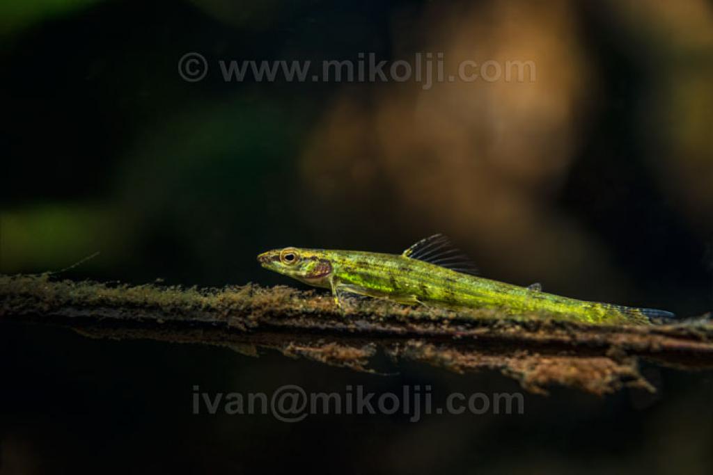 Тело стройное, удлиненное. Рот очень маленький. Самцы мельче и стройнее самок. Окраска: если рыба сидит на листьях растений, то она имеет приятную зеленую окраску с темными пятнами на боках. На темном грунте рыбка приобретает коричневую окраску со светлыми проблесками. Вырастает до 3,3 см SL.