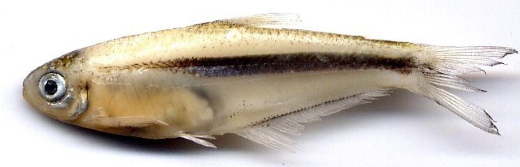 Тело удлиненное, стройное с небольшой головой. Самцы мельче и стройнее самок. Окраска: спина серая, бока серебристо-серые с темной горизонтальной полосой. Вырастает до 6,8 см SL