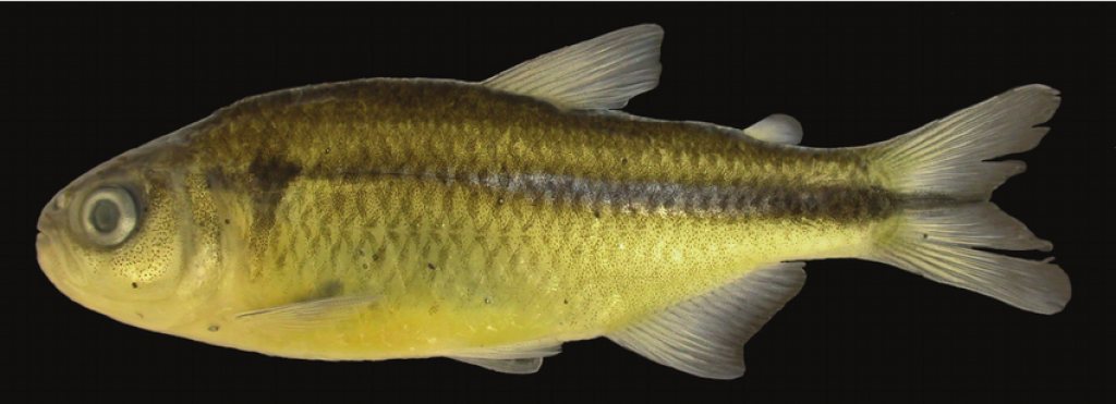 Тело удлиненное с крупной головой. Самцы мельче и стройнее самок. Окраска: общий фон серебристый с темной горизонтальной полосой. За жаберной крышкой темное пятно. Вырастает до 7,2 см SL