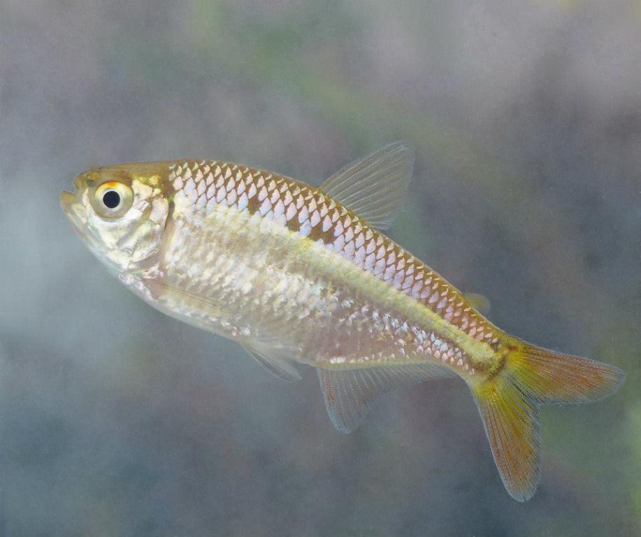 Тело короткое, высокое в спине и сжатое с боков. Самцы мельче и стройнее самок. Окраска: спина светло-коричневая, бока серебристые. Хвостовой плавник красно-желтый. Размеры неизвестны.