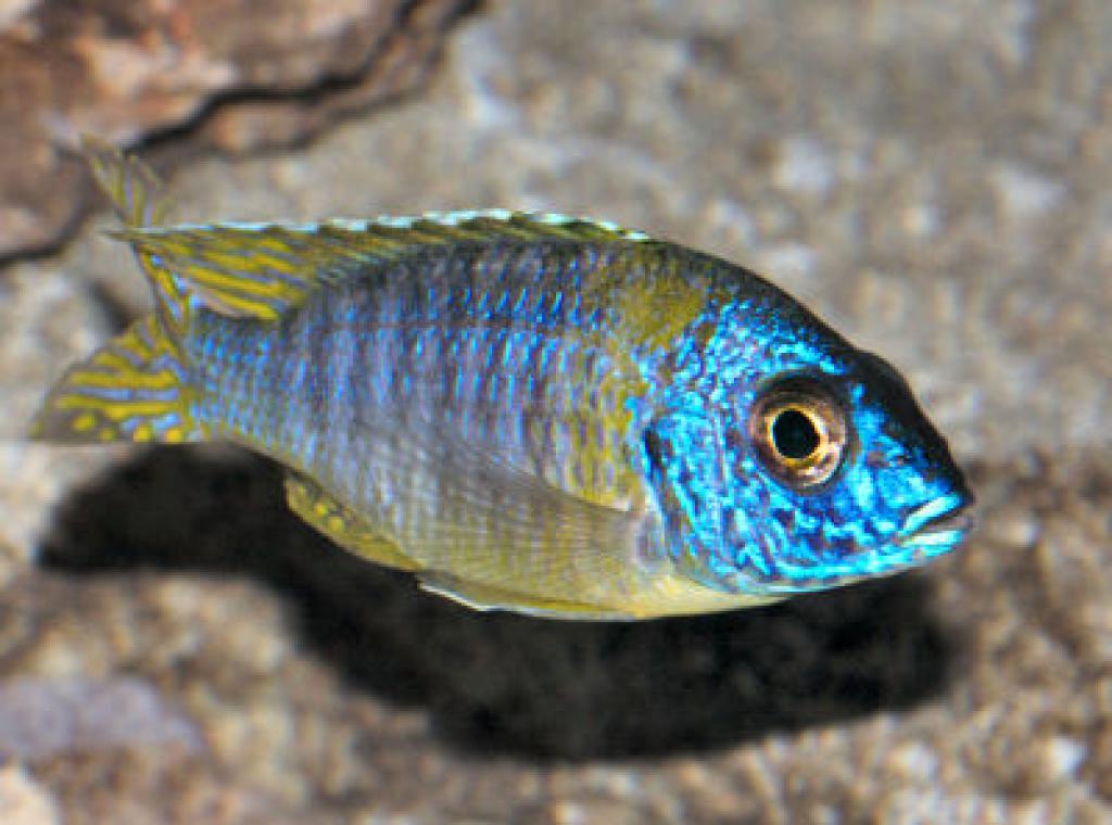 Тело удлиненное с высокой спиной и крупной головой. Самцы ярче окрашены и с удлиненными конами спинного и анального плавников. Окраска: голова голубая с мраморным рисунком. Бока светло-голубые с темными полосами и желтыми вставками. Спинной плавник с белой каймой. Вырастает до 7,8 см SL