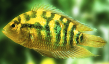 Тело короткое, высокое в спине с крупной головой. В спинном плавнике 15-16 колючих лучей и 10-12 мягких, в анальном 7-8 колючих и 9-10 мягких. Самцы крупнее самок и с вытянутыми концами спинного и анального плавников. Окраска: общий фон желтый с горизонтальной и вертикальными темными полосами. Вырастает до 7,3 см SL