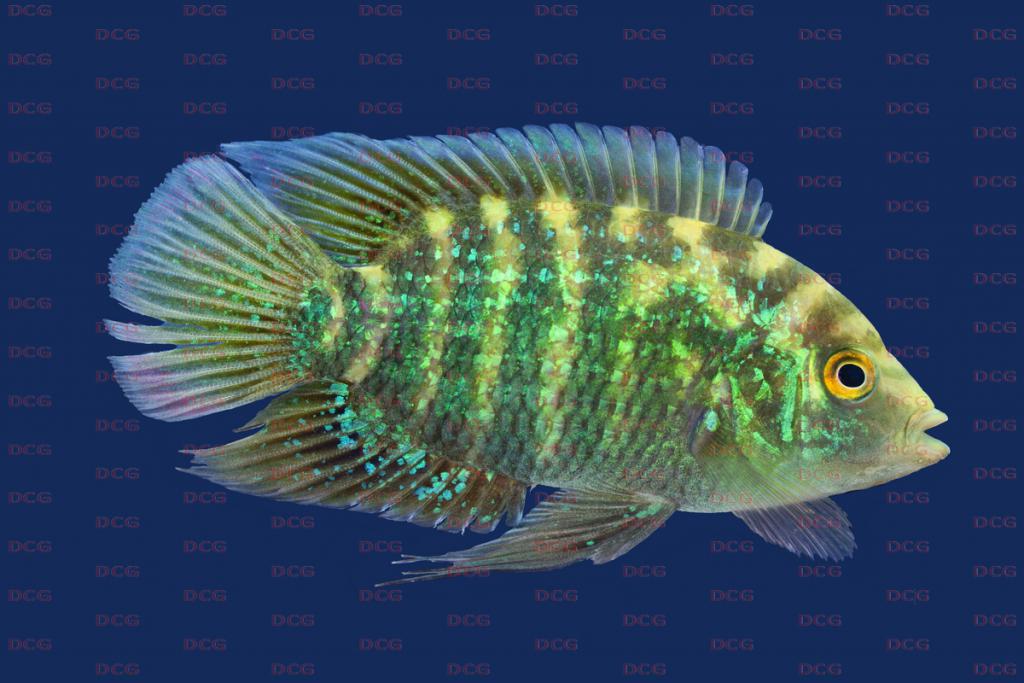 Тело короткое с небольшой головой и высокое в спине. В спинном плавнике 16 колючих и 10-11 мягких лучей, в анальном 7-8 колючих и 9-10 мягких. Самцы крупнее самок и с вытянутыми концами спинного и анального плавников. Окраска: общий фон зеленовато-желтый с изумрудными чешуйками и темными полосами. Вырастает до 9,6 см SL