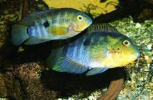Тело короткое с высокой спиной и крупной головой. В спинном плавнике 16-18 колючих лучей и 7-10 мягких, в анальном 8-9 колючих и 6-8 мягких. Самцы крупнее самок и с удлиненными концами спинного и анального плавников. Окраска: голова желтая, тело голубое. На корпусе крупной черное пятно. Вырастает до 11 см SL