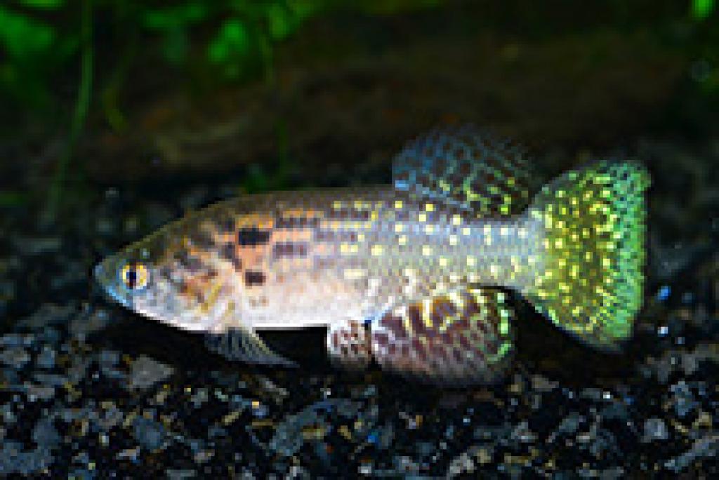 Тело короткое с нормальной головой. Самцы крупнее самок, головастее и ярче окрашены. Окраска: общий фон коричнево-синий с белыми пятнами на боках. Хвостовой плавник желтый с изумрудным кантом и черным сложным рисунком. Размеры неизвестны.