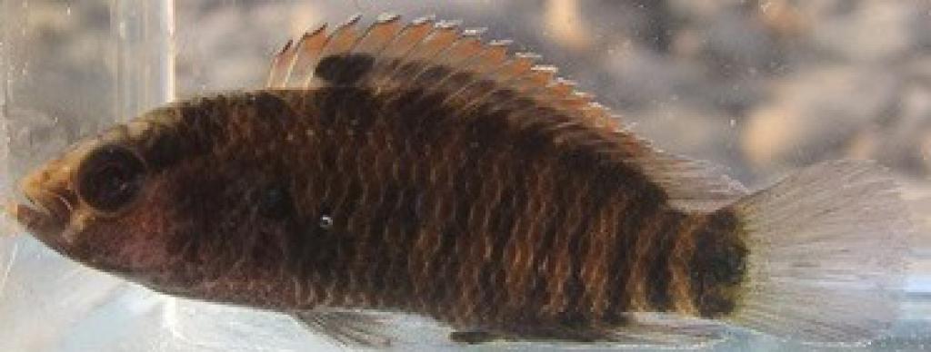 Тело не сильно удлиненное с крупной головой. Самцы с более коротким телом. Окраска: общий фон золотисто-коричневый с темными вертикальными полосами. На спинном плавнике черное пятно и оранжевая верхняя часть. Вырастает до 4,8 см SL