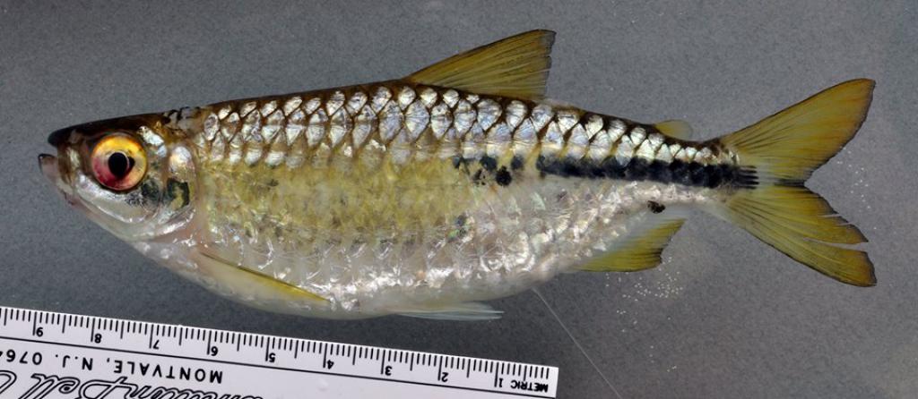 Тело удлиненное, немного высокое в спине. Хвостовой стебель очень короткий. В спинном плавнике 10 мягких лучей, Самцы стройнее самок и с более длинным анальным плавником. Окраска: общий фон серебристо-серый с темной полосой вдоль боковой линии. Плавники желтые. Вырастает до 12,8 см SL
