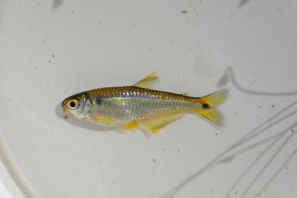 Тело удлиненное, стройное и сжатое с боков. Самцы стройнее самок. Окраска: спина оливковая, бока золотистые с голубым отливом. У основания хвостового плавника черное пятно. Все плавники желтые. Вырастает до 3 см SL