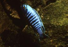 Тело короткое с крупной головой. Самцы более яркие. Окраска самцов: общий фон голубой с черными вертикальными полосами. Спинной плавник голубой с черной полосой. Вырастает до 8,6 см SL