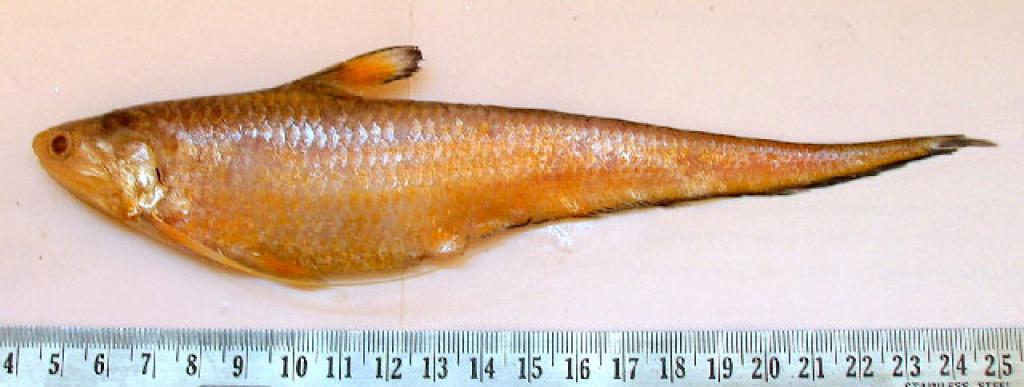 Тело удлиненное с выдающимся килем и небольшой головой. В анальном плавнике 80 мягких лучей. Самки более плотные и немного крупнее. Окраска: спина серая, бока серебристо-серые. Спинной и хвостовой плавники желтые с черной каймой, анальный плавник черный. Вырастает до 15 см TL
