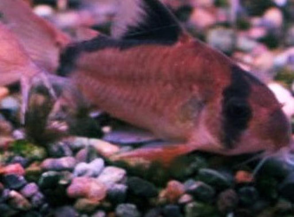 Тело удлиненное (для рода) с высокой спиной. Самки шире (если смотреть сверху) и крупнее самцов. Окраска: общий фон бежевый. Вдоль спины (заходит не много на бока) темная полоса, которая опускается на основание хвостового плавника. Через глаз проходит темная полоса. Спинной плавник на 2/3 и полностью (значительно реже) темный. Встречаются особи с еле заметным крапом на боках. Вырастает до 4,8 см SL.