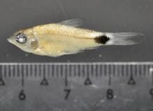 Тело удлиненное, стройное с крупной головой. Самцы мельче и стройнее самок. Окраска: бока серебристые с темной полосой вдоль боковой линии и черным пятном у основания хвостового плавника. Вырастает до 4,4 см SL