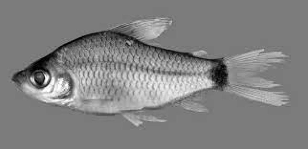 Тело короткое с высокой спиной и большой головой. В спинном плавнике 11-12 мягких лучей, в анальном 9-10. Самцы стройнее самок. Окраска: общий фон серебристо-серый с темной горизонтальной полосой. У основания хвостового плавника жирная полоса. Вырастает до 3,9 см SL