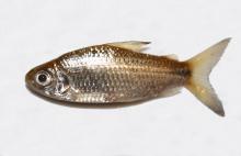 Тело короткое, высокое в спине и с крупной головой. Самцы стройнее самок. Окраска: общий фон серебристо-серый с золотистым отливом. Спинной плавник с черной кисточкой. Вырастает до 10,4 см TL