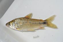 Тело немного удлиненное и не очень высокое в спине. Самцы стройнее самок и немного мельче. Окраска: спина оливковая, бока золотистые с небольшими темными пятнами вдоль боковой линии. У основания хвостового плавника темное крупное пятно. Вырастает до 26,3 см TL