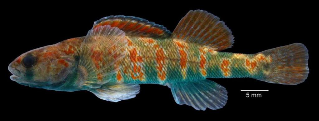 Тело удлиненное с крупной головой. Самцы мельче, стройнее самок и ярче окрашены. Окраска: спина и бока до боковой линии светло-коричневые, ниже боковой линии - сине-зеленое. Вдоль тела оранжевые полосы. Первый спинной плавник оранжевый с темно-синей каймой. Вырастает до 5,5 см TL.