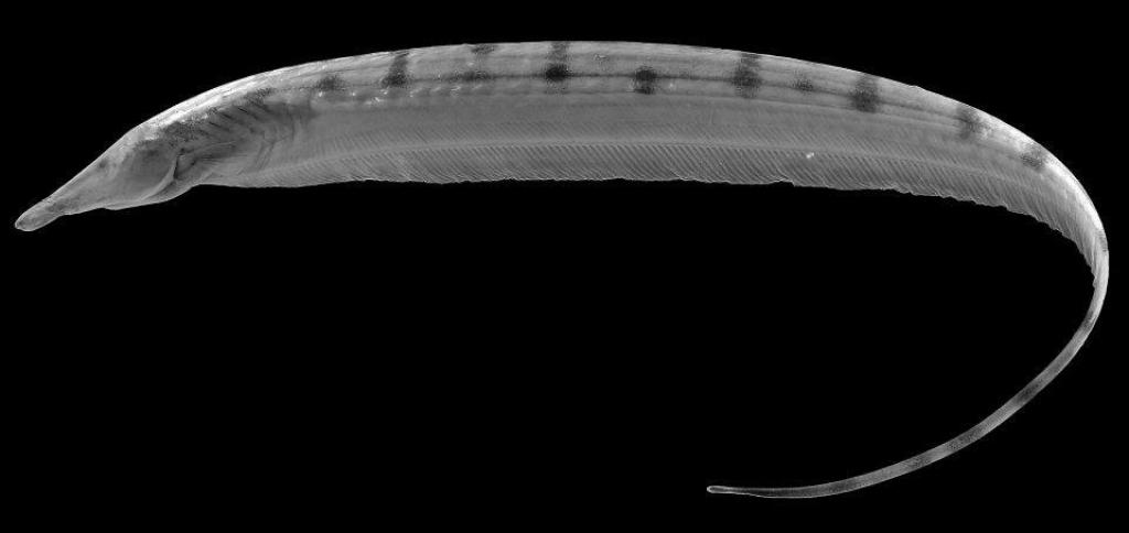Тело удлиненное и сжатое с боков. Корпус более высокий, чем у других родственных видов. Трубчатое рыло короткое и относительно толстое. Половые различия неизвестны. Окраска: тело полупрозрачное с голубоватым оттенком. На спине и боках редкие коричневые пятна. Вырастает до 18 см SL.