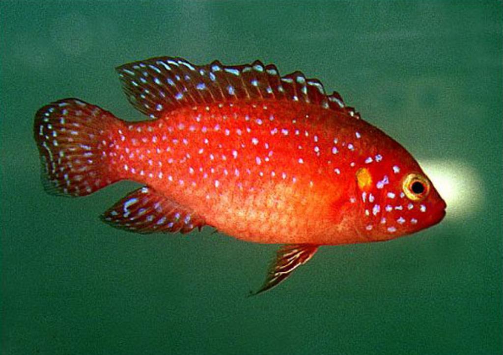 Тело короткое, высокой в спине и с крупной головой. Самцы крупнее самок и с удлиненными концами спинного и анального плавников. Окраска: общий фон красный с мелкими голубыми пятнами на корпусе, голове и на плавниках. Вырастает до 8,2 см SL