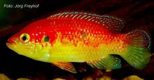 Тело несколько удлиненное с высокой спиной и небольшой головой. Самцы крупнее самок и с вытянутыми концами спинного и анального плавников. Окраска: Верхняя часть тела и головы красные, нижняя - желтые с мелкими голубыми пятнами. Вырастает до 6,5 см TL