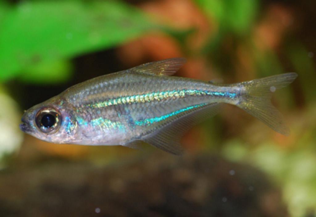 Тело удлиненное с крупной головой и большими глазами. Самцы мельче и стройнее самок (у самок более высокое тело). Окраска: общий фон неоновый со светящейся полосой на боках. Спинной и хвостовой плавники зеленовато-желтые. Вырастает до 4,1 см SL