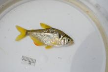 Тело короткое, высокое в спине и сжатое с боков. Самцы немного мельче самок и не такие высокие в спине. Окраска: спина оливковая, бока серебристые с желтоватым оттенком. Все плавники желтые (анальный с красной каймой). Вырастает до 4,2 см SL.