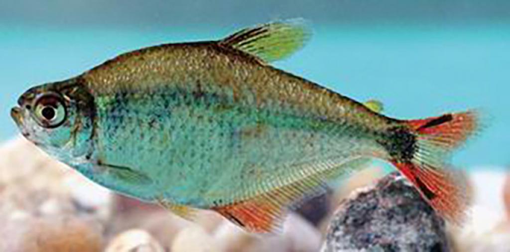 Тело короткое, лещевидное с очень высокой спиной и небольшой головой. В спинном плавнике 10-12 мягких лучей, в анальном 31-40. Самцы мельче и стройнее самок. Окраска: общий фон голубой. Анальный и хвостовой плавник красные. Спинной желто-зеленый с темным пятном. На хвостовом плавнике две черные полоски. Вырастает до 5,1 см SL