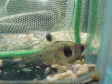 Тело короткое, высокое в спине и сжатое с боков. Самцы мельче самок и с более крупным спинным плавником. Окраска: тело полупрозрачное с зеленоватым отливом. За жаберной крышкой крупное черное пятно. По всему телу небольшие темные пятна, а сами бока с мелкую сетку. Вырастает до 4 см.
