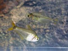 Тело короткое, высокое в спине. Самцы немного крупнее и ярче окрашены. Окраска: тело прозрачное с редкими серебристыми блестками. У основания хвостового плавника черное пятно. Плавники желтые. Вырастает до 3,9 см SL