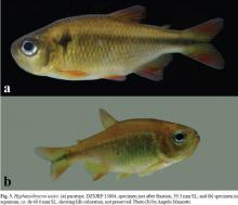 Тело удлиненное с высокой спиной и крупной головой. В спинном плавнике 9-10 мягких лучей, в анальном 15-20. Самцы стройнее самок и с выпуклым анальным плавником. Окраска: общий фон золотисто-серый с темной полосой вдоль боковой линии и черным пятном за жаберной крышкой. Плавники оранжевые или красные (у самок бледные до полной прозрачности). Вырастает до 5,3 см SL https://www.facebook.com/Ichthyology.of.the.world/?__tn__=%2CdkCH-R-R&ei...