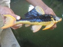 Тело удлиненное с широкой и плоской головой. Самцы имеют более развитые лучи первого грудного плавника. Окраска: Молодые особи темно-коричневого цвета с мелкими желтоватыми пятнами и желтыми плавниками. У половозрелых особе желтизны больше - помимо плавников, желтеет еще брюхо и хвостовой стебель. старые особи могут быть полностью желтые или большая часть корпуса окрашена в желтый цвет. Пятна исчезают полностью. Вырастает до 40, 5 см SL.