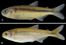 Тело удлиненное и сжатое с боков. Голова маленькая с крупными глазами. В анальном плавнике 12-15 мягких лучей. Самцы стройнее и мельче самок. Окраска: спина светло-коричневая, бока серебристые с голубым отливом и черной горизонтальной полосой. Вырастает до 5,8 см SL https://www.facebook.com/Ichthyology.of.the.world/?__tn__=%2CdkCH-R-R&ei...