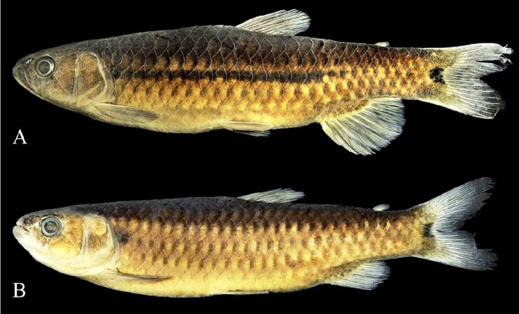 Тело удлиненное, вальковатое. Самцы с более высокой спиной и имеют черную полосу вдоль боковой линии. В целом, спина коричневатая, бока золотистые. За жаберной крышкой и у основания хвостового плавника по маленькому темному пятну. Вырастает до 12,4 см SL.