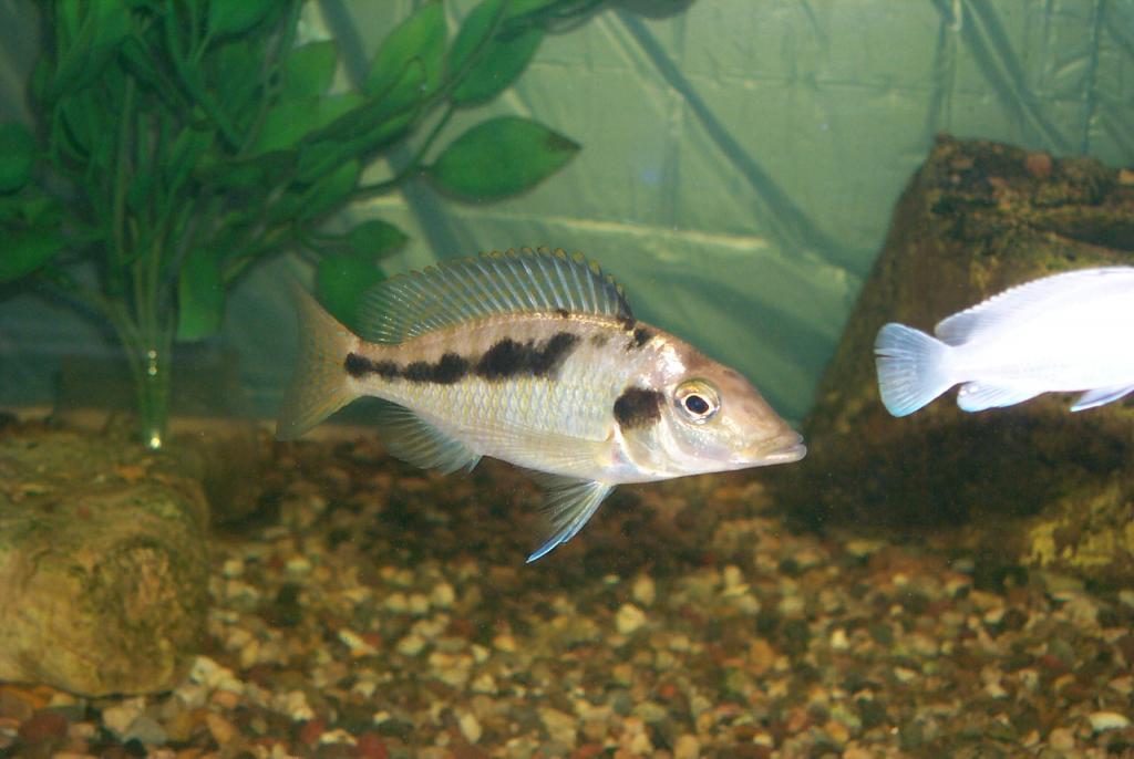 Тело длинное с сильно вытянутым рылом и сжатое с боков (особенно голова). Нижняя челюсть значительно выступает вперед. Самки окрашены в светло-зеленый или серый цвет с черной горизонтальной полосой. На боках 7-8 нечетких полос. У самцов маркировка такая же, только окрашены они в голубоватые и синие тона. Чешуйки имеют оранжевые вкрапления. Вырастает до 14 см.