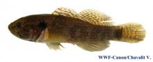 Тело удлиненное с крупной головой. Самцы в брачный период темнеют и на голове вырастает жировая шишка. Окраска: общий фон коричневый с пестринкой и вертикальными полосами. Вырастает до 5,5 см SL