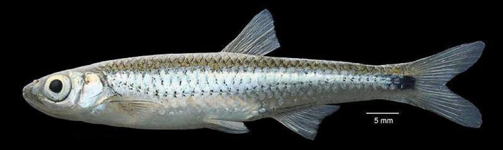 Тело удлиненное с заостренным рылом и большими глазами. Самцы стройнее самок и с более длинным телом. Окраска: спина оливковая, бока серебристо-голубоватые со светлой горизонтальной полосой и черным пятном у основания хвостового плавника. Вырастает до 9 см TL