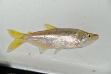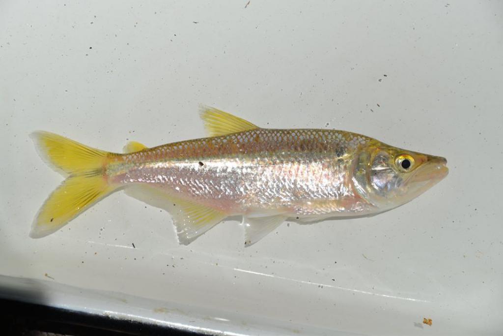 Тело удлиненное с вытянутым рылом и острыми игловидными зубами. Самцы стройнее самок и немного мельче. Окраска: спина оливковая, бока серебристые. Парные плавники прозрачные, остальные желтые. Вырастает до 16 см SL