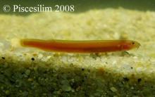 Тело вытянутое в длину, немного высокое. У самцов расширен первый луч грудных плавников. Окраска: общий фон коричнево-розовый. У основания хвостового плавника вертикальная, темная полоса. Вырастает до 3,8 см SL.