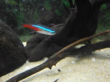 Тело вытянутое, немного сжатое с боков. Самцы мельче, стройнее и у них голубая полоска прямая (у самок изогнутая). Окраска: тело серенькое. Вдоль тела тянется голубая полоса, которая заходит на глаз, что делает радужную оболочку глаза тоже голубой. Ниже, до уровня спинного плавника проходит красная полоса. Вырастает до 3 см.