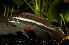 Тело удлиненное с небольшой головой. В спинном плавнике 15-17 колючих лучей и 8-10 мягких, в анальном 3 колючих и 6-8 мягких. Самцы ярче окрашены и с удлиненными концами спинного и анального плавников. Окраска: общий фон коричневый с кремовой горизонтальной полосой. Брюхо малиновое. Вырастает до 7,8 см SL