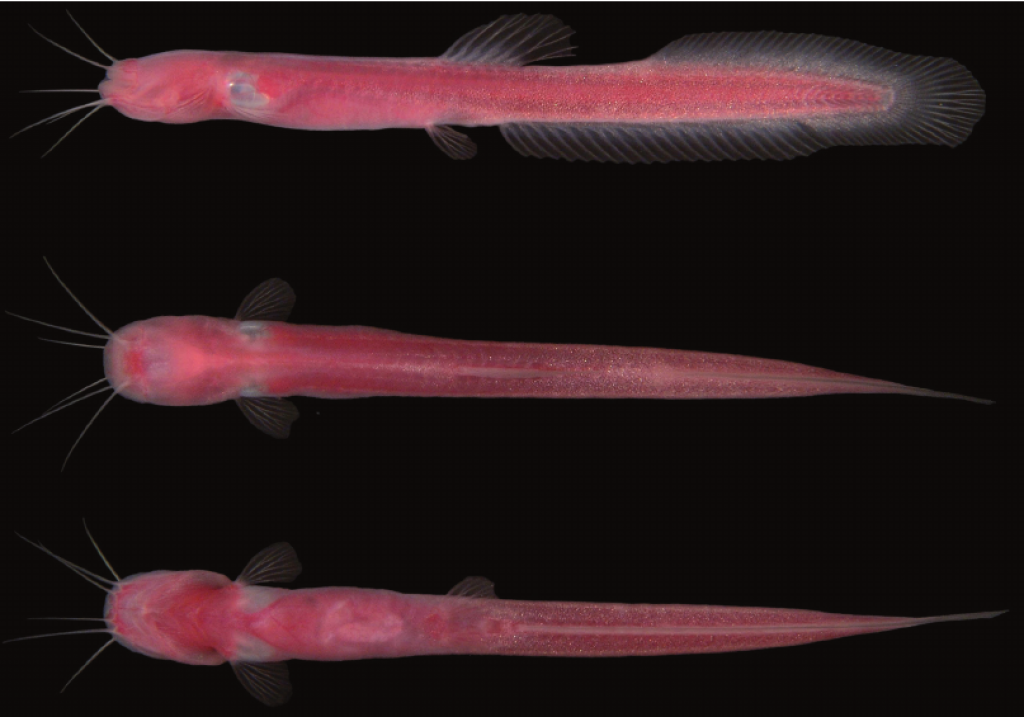 Тело удлиненное с маленькой головой округлой формы. Глаз нет. Анальный и спинной плавники сросшие с хвостовым и имеют прямоугольную форму (хвостовой немного закругленный). Половые различия неизвестны. Окраска: общий цвет темно-розовый с прозрачными плавниками. Вырастает до 3,8 см SL