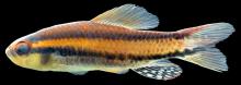 Тело короткое с высокой спиной и толстым хвостовым стеблем. Самцы стройнее и крупнее самок и у них брюшные плавники закругленные. Окраска: общий фон красно-оранжевый с двумя коричневыми полосами выше и ниже боковой линии. Спинной плавник красно-оранжевый, анальный черный с белыми пятнами. Вырастает до 4,7 см SL.