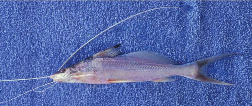 Тело удлиненное, стройное с небольшой головой. Жировой плавник длинный. Верхне челюстные усы длиннее тела (TL). Половые различия неизвестны. Окраска: общий фон серебристо-серый. У основания спинного плавника и на конце самого плавника по черному пятну. Вырастает до 17 см SL