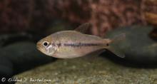 Тело относительно короткое, высокое в спине и сжатое с боков. Самцы немного мельче и стройнее самок. Окраска: бока бежевые с темной полосой вдоль боковой линии и небольшим черным пятном у основания хвостового плавника. Кроме того, на боках расположены небольшие пятна от темно-коричневого до ярко красного цвета. Вырастает до 7,8 см SL